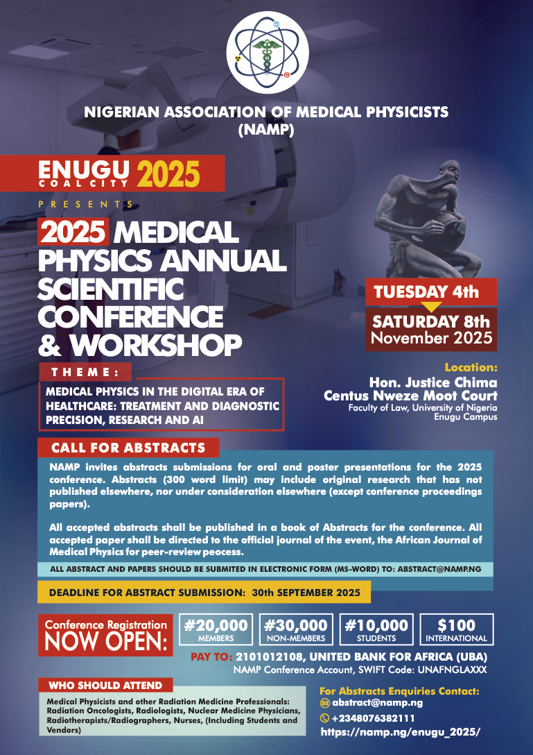 Registration is now open for all participants for the 2025 Annual Scientific Conference and Workshop of the Nigerian Association of Medical Physicists, holding in Enugu. Fill the registration form and proceed to make payment.