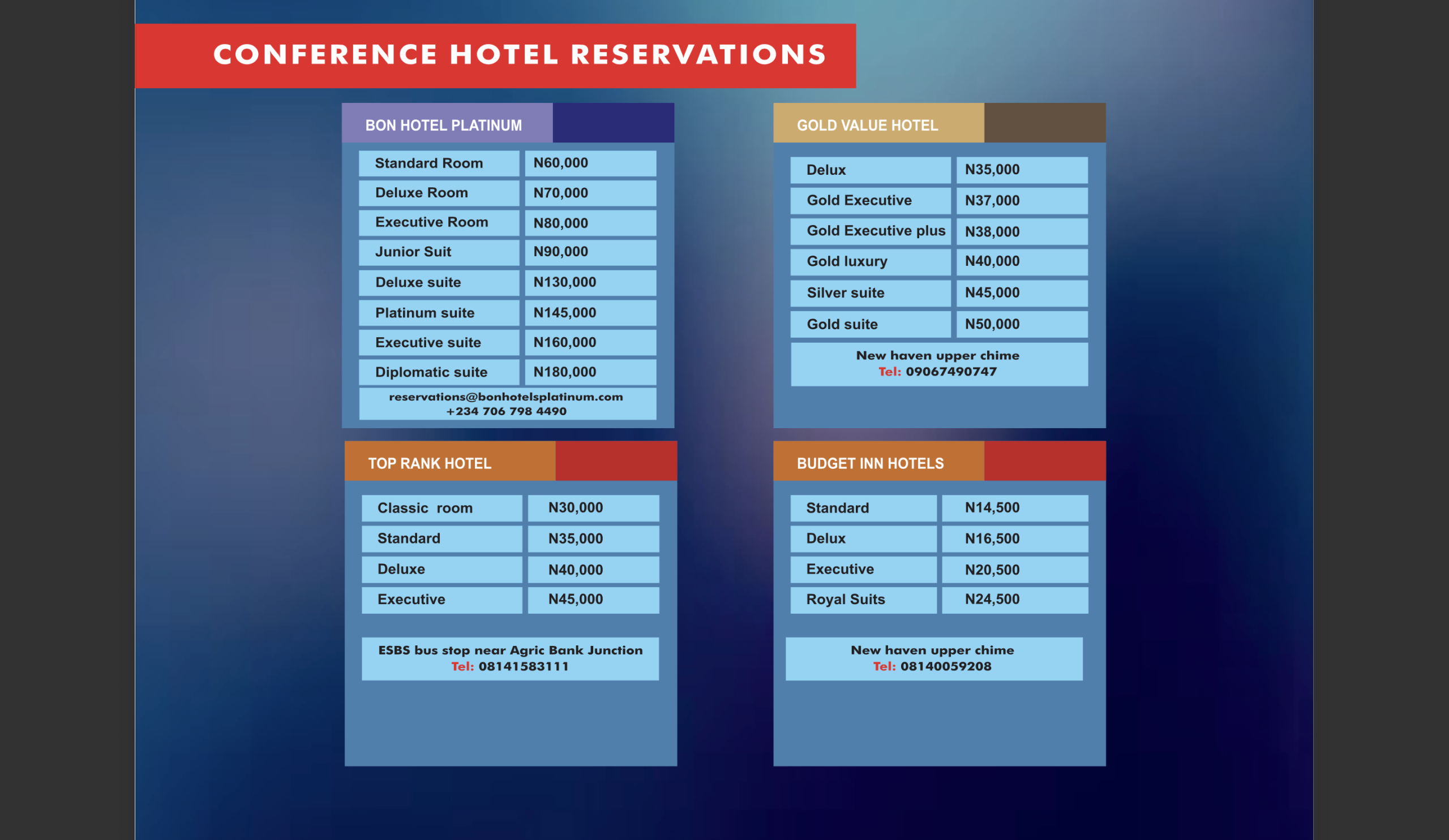 Kindly make payment (NGN) to: 2101012108. NAMP Conference. United Bank of Africa (UBA). Swift Code: UNAFNGLAXXX